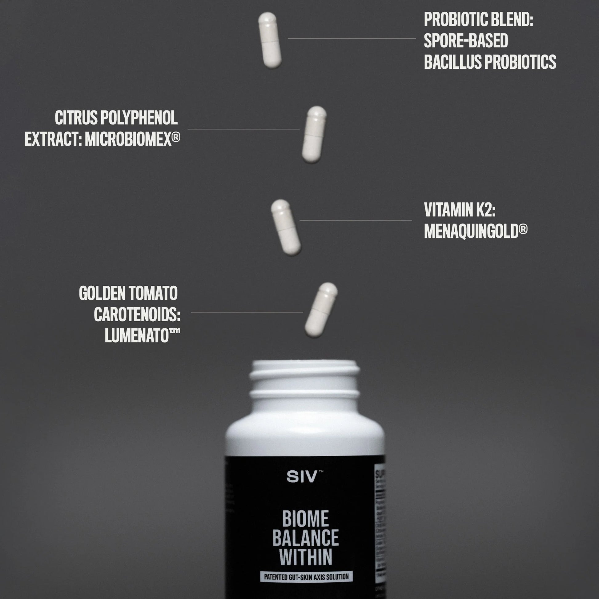 A probiotic-powered skincare supplement designed to support the gut-skin axis and overall skin microbiome. SIV Biome Balance Within is formulated with a powerhouse combination of spore-based probiotics, antioxidant carotenoids, citrus polyphenols, and vitamin K2 that target the gut-skin axis for visible change in your skin’s tone, texture, and resilience. This product supports a hydrated, firm complexion, promotes resilience to UV and environmental stressors, and helps smooth non-cystic acne blemishes for lasting clarity.
